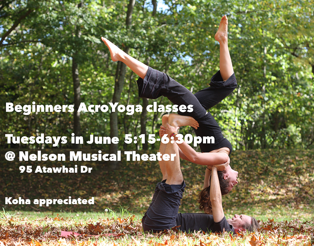 It was an amazing opportunity for highly skilled professionals in one area of expertise to try their hand at another and I had the privilege of teaching Acroyoga to two dozen eager creatives. I didn't get a single picture all weekend, but I am excited to say that it will be happening all over again next year, here in Nelson!